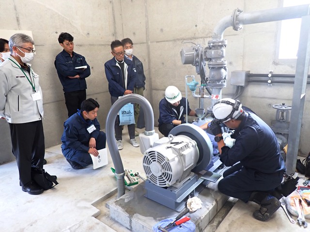 今回の訓練は、宮崎県土地改良事業団体連合会 施設管理課の齊藤課長並びに西河係長を講師にお招きし、当地区百原揚水機場においてポンプのグランドパッキン交換を行いました。また、九州農政局