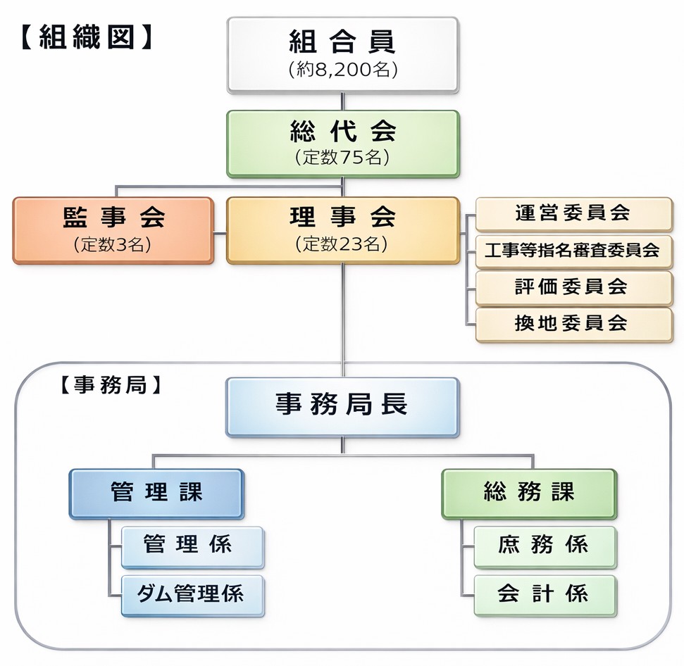 - 土地改良区はその地区内の総組合員によって組織され、組合員が選挙した総代の総代会において、組合員の意志が決定(総代制の場合)されています。その運営は総代が選任した役員によって行われ、運営に要する経費は、組合員の負担(賦課金等)により賄われます。