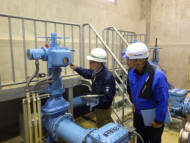 電動吐出弁取替修繕の完成検査を行いました 昨年3月から動作不良による不具合が生じていた払川揚水機場2号電動吐出弁について、受注者㈱鶴見製作所による取替修繕が完了し、令和8年2月8日に完成検査を行いました。